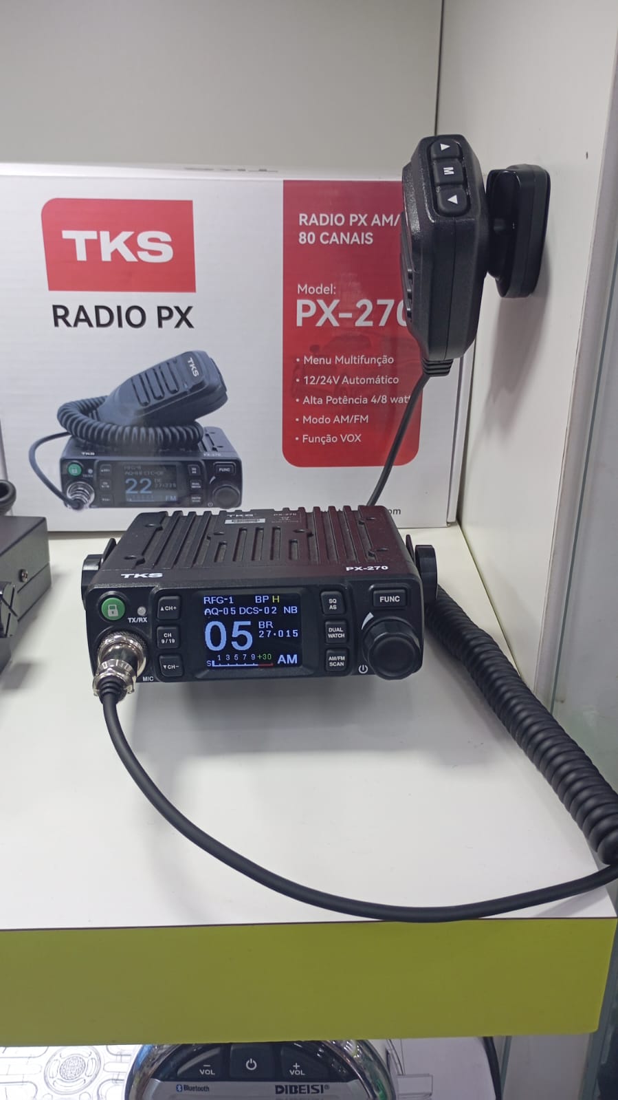 Radio TKS PX-270 (Roger Beep Frequencimetro) 80 canais AM/FM Design elegante Display colorido OLED Roger Beep com 3 tipos diferentes de toque Frequencimetro (exibe a frequencia no display) Opera em 12 ou 24 volts automatico Potencia de ate 8w S-Meter Funcao bloqueio de teclado Auto Squelch PTT com botoes para troca de canais ? Canais: 80 ? Faixas de frequencia: Canal 1: 26,965 MHz ? Canal 80: 27,855 MHz (Varia de acordo com o padrao) ? Controle de frequencia: Sintetizador (PLL) ? Temperatura de operacao: -30°C ate 50°C ? Tensao de alimentacao: 12/24v ? Consumo de corrente: Max 3A ? Conector de antena: UHF Femea ? Potencia de saida: AM/FM 8W ? Impedancia de saida: 50 Ohms ? Sensibilidade: 12db FM 12db AM ? Potencia de audio: 3W @ 8 Ohms ? Saida alto falante externo (nao acompanha): 8 Ohms ? desliga alto falante interno quando conectado ? Alto falante externo P/ PA: 8 Ohms (deve ser conectado ao jack PA situado atras do radio) ? Peso: 786gr